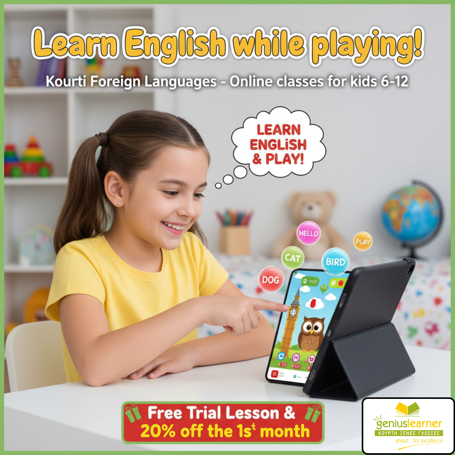 Με μακρόχρονη εμπειρία στα online μαθήματα, γνωρίζουμε τι χρειάζεται για να είναι η εκμάθηση διασκεδαστική και αποτελεσματική. Χρησιμοποιούμε σύγχρονα διαδραστικά εργαλεία που κρατούν αμείωτο το ενδιαφέρον των παιδιών, ενώ παράλληλα, κρατάμε στενή και συχνή επικοινωνία με τους γονείς για την πορεία του κάθε μαθητή. Ειδικά για εσάς που μένετε σε περιοχές εκτός μεγάλων πόλεων, προσφέρουμε μια μοναδική ευκαιρία: Δωρεάν δοκιμαστικό μάθημα και 20% έκπτωση για τον πρώτο μήνα γνωριμίας! Επικοινωνήστε μαζί μας για να μάθετε περισσότερα και να ξεκινήσετε άμεσα. Στείλτε μήνυμα στην σελίδα ή μέιλ στη διεύθυνση ηλεκτρονικού τα ταχυδρομείου που θα βρείτε στις πληροφορίες. #kourtilanguages_geniuslearner #ΚούρτηΞένεςΓλώσσες #onlineμαθήματα #Αγγλικά #μαθήματαπαιδιών #ΕκπαίδευσηΑποΑπόσταση #ΔωρεάνΜάθημα #Επαρχία #ΑπομακρυσμένεςΠεριοχές
